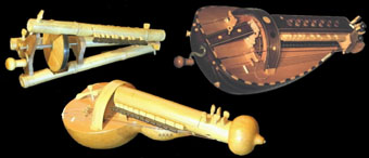 Vielles à roue: instruments à cordes frottées par un archet circulaire que l'on retrouve un peu partout en Europe à partir du Xe siècle. Les deux modèles de gauche (vielle Bambou et Cucurbitavielle à roue sont des créations, le modèle de droite est plus 'conventionnel'.