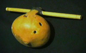 Cocut et canisse: Ocarina (flûte globulaire) construit à partir d'un cougourdon (calebasse). Le roseau qui y est fixé est fendu sur la moitié de sa longueur et est muni d'un orifice sur lequel on pose la bouche pour faire varier le timbre de l'instrument. Le jeu de cet instrument s'apparente à celui d'une guimbarde.