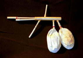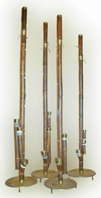 Tambours de pluie: longs bambous (2,5m de haut) du sommet desquels des gouttes d'eau tombent sur des membranes, au gré de l'instrumentiste, créant des polyrythmies aléatoires.