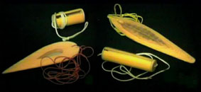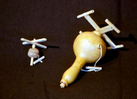 Estrevèl: Sifflet tournoyant à l'aide d'une ficelle que l'on enroule autour d'un axe à la manière d'un yoyo. L'instrument traditionnel est fait à partir d'une coquille de noix, l'autre, de création, à partir d'un cougourdon